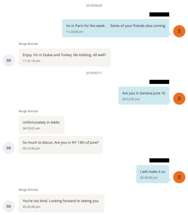 On 11 May, Epstein made another attempt to meet up. “Are you in Geneva on 16 June?” he texted. “Unfortunately in Addis,” Brende answered. But then Brende wrote that he had so much to discuss with Epstein and asked if he would be in New York on 13 June. Epstein replied that they would make it happen. “You’re far too kind. Looking forward to seeing you,” Brende responded.