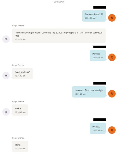 On 13 June 2019—the very day they were due to meet—the texting between the two continued. The barbecue dinner Brende had mentioned earlier was evidently a reception that proved less exciting than expected. He texted that the traffic was “cooperating” and asked if it would be all right to arrive a bit earlier, which Epstein confirmed. Brende thanked him and noted that it might be rude to turn up earlier than agreed, adding a smiley. “Must have been the tale of a bore,” Epstein replied, alluding to the reception being rather tedious. (Incidentally, a Mark Twain quotation.)