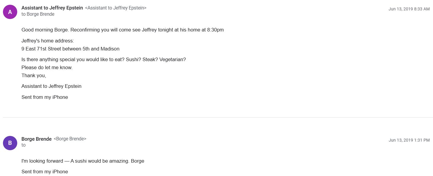 “Good morning, Børge. Just to confirm that you are coming to Jeffrey’s place tonight at his home at 8:30 p.m. Jeffrey’s address: 9 East 71st Street, between 5th and Madison. Is there anything in particular you would like to eat? Sushi? Steak? Vegetarian? Please let me know. Thank you, Assistant to Jeffrey Epstein”