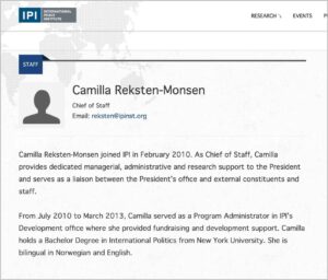 Camilla Reksten-Monsen as she was described on the International Peace Institute’s website until she left the position in 2021.