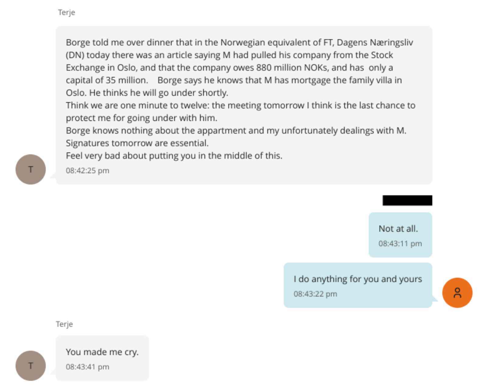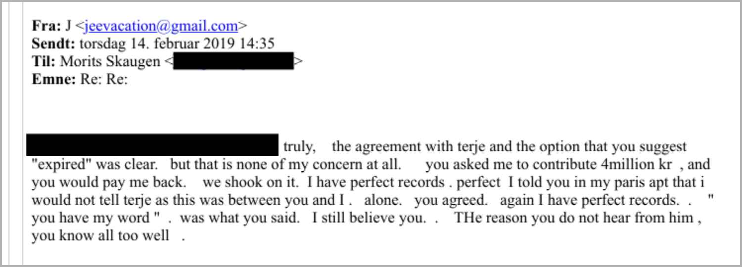 Epstein: Sorry, you said I had to contribute 4m NOK and you would pay me back when you could. If you intend to break your promise, of which I have perfect proof, please let me know. [If it becomes necessary, I fear it will be unpleasant.