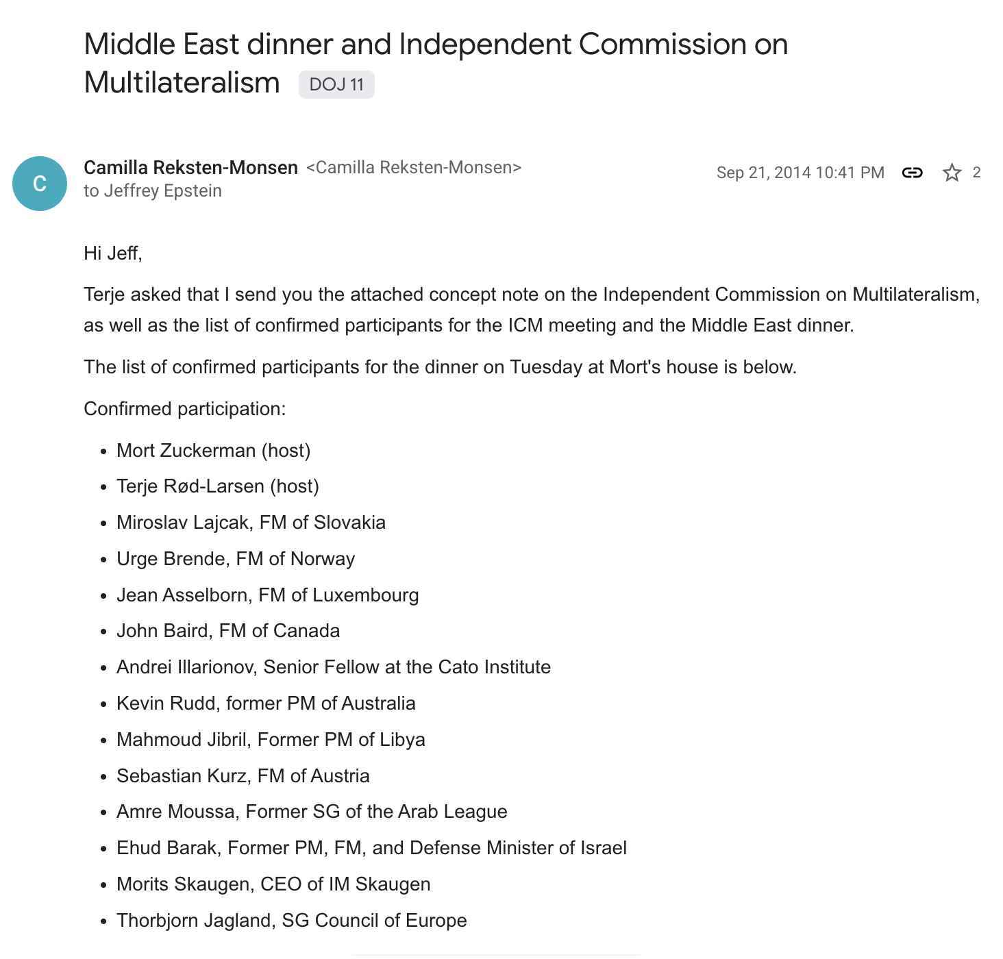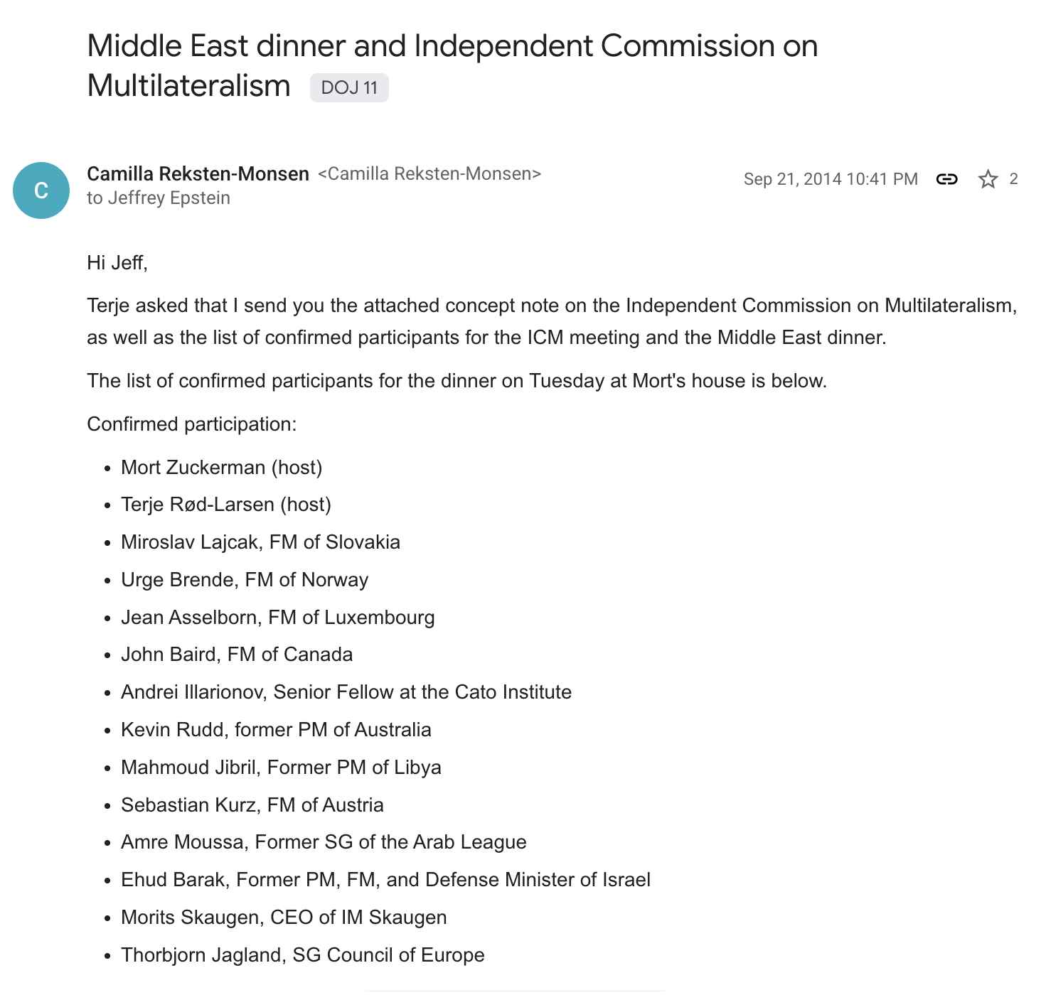 In 2014, she hosts a Middle East Dinner with a number of foreign ministers and former heads of state on behalf of Rød-Larsen, at the home of Jewish media billionaire and Israel lobbyist Mortimer Zuckerman.