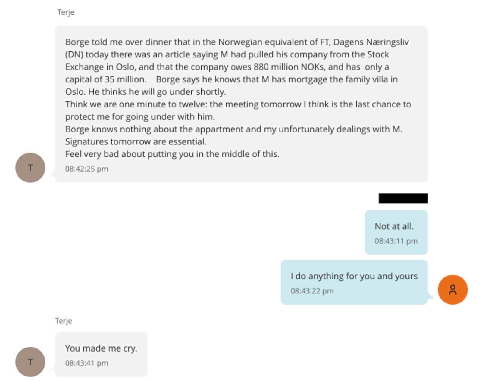 The following day, Rød-Larsen sends a text message about what he has heard about Skaugen’s financial problems from Børge Brende, a former Norwegian minister who is Klaus Schwab’s protegée and current CEO of World Economic Forum.