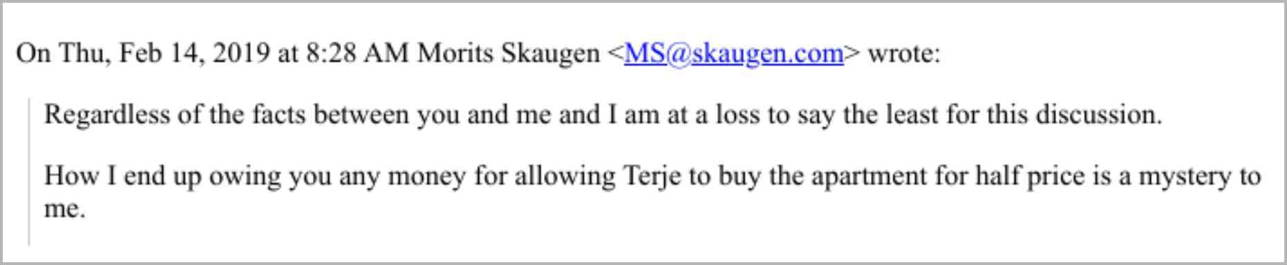 On the same day, Epstein has a dialogue with lawyer Moljord about an email sent by Skaugen. The entire email can be read at the bottom of the case. Moljord is not impressed: