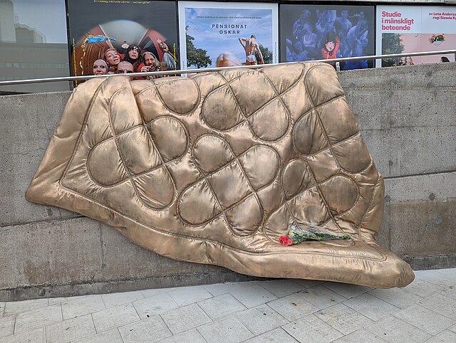 On last year’s anniversary, the memorial “Fredad plats / Sanctuary” was inaugurated at Sergels torg: a gold-colored bronze blanket with built-in heating elements, laid over one of the square’s walls. Its shape resembles a blanket and is meant to “symbolize protection and warmth throughout life—from cradle to grave.”